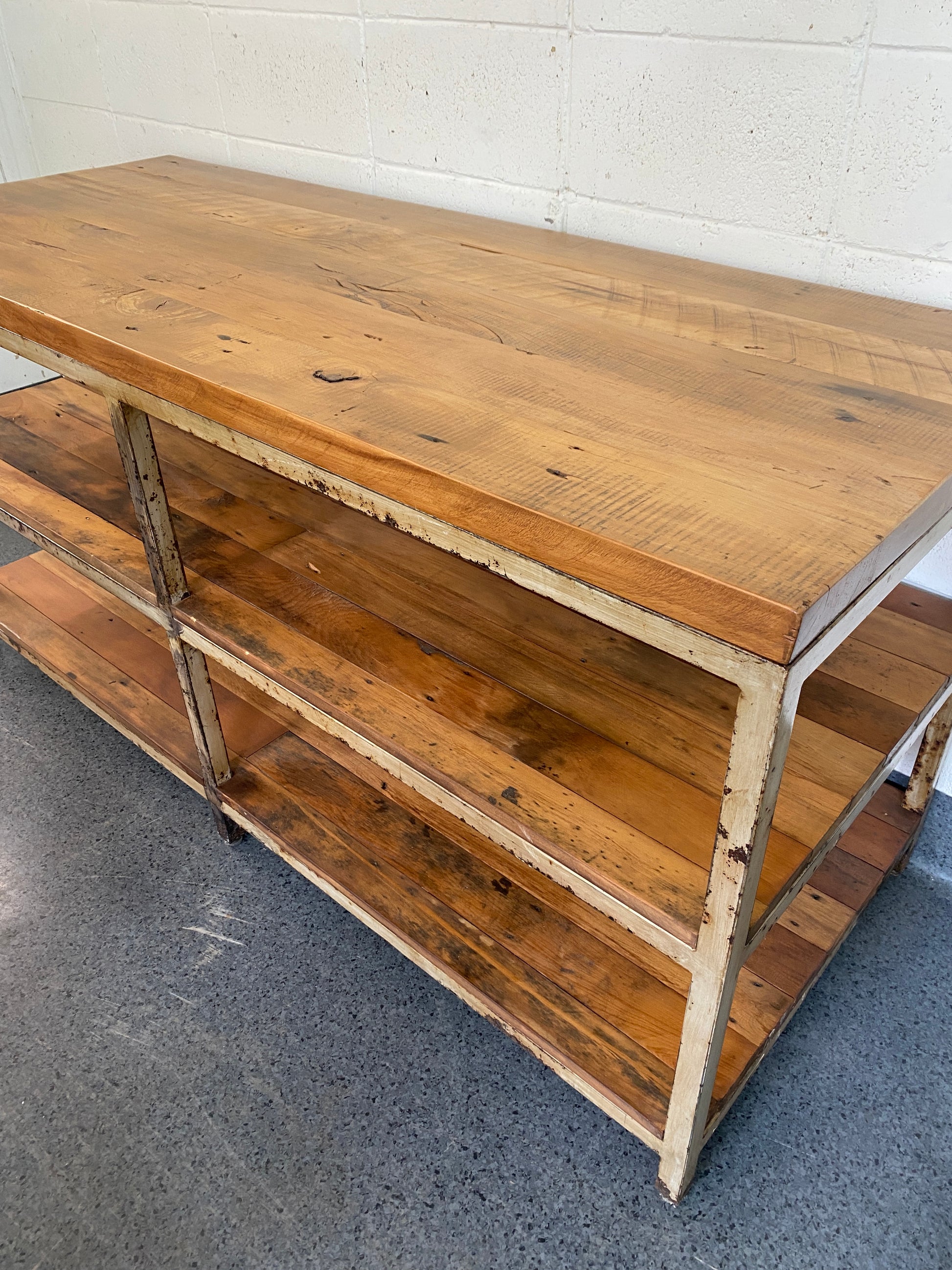 The top is 40mm Rimu floor joists and the shelves are 20mm Rimu flooring, all with the original character and patina. The finish is smooth and practical for a stunning country kitchen or retail space.