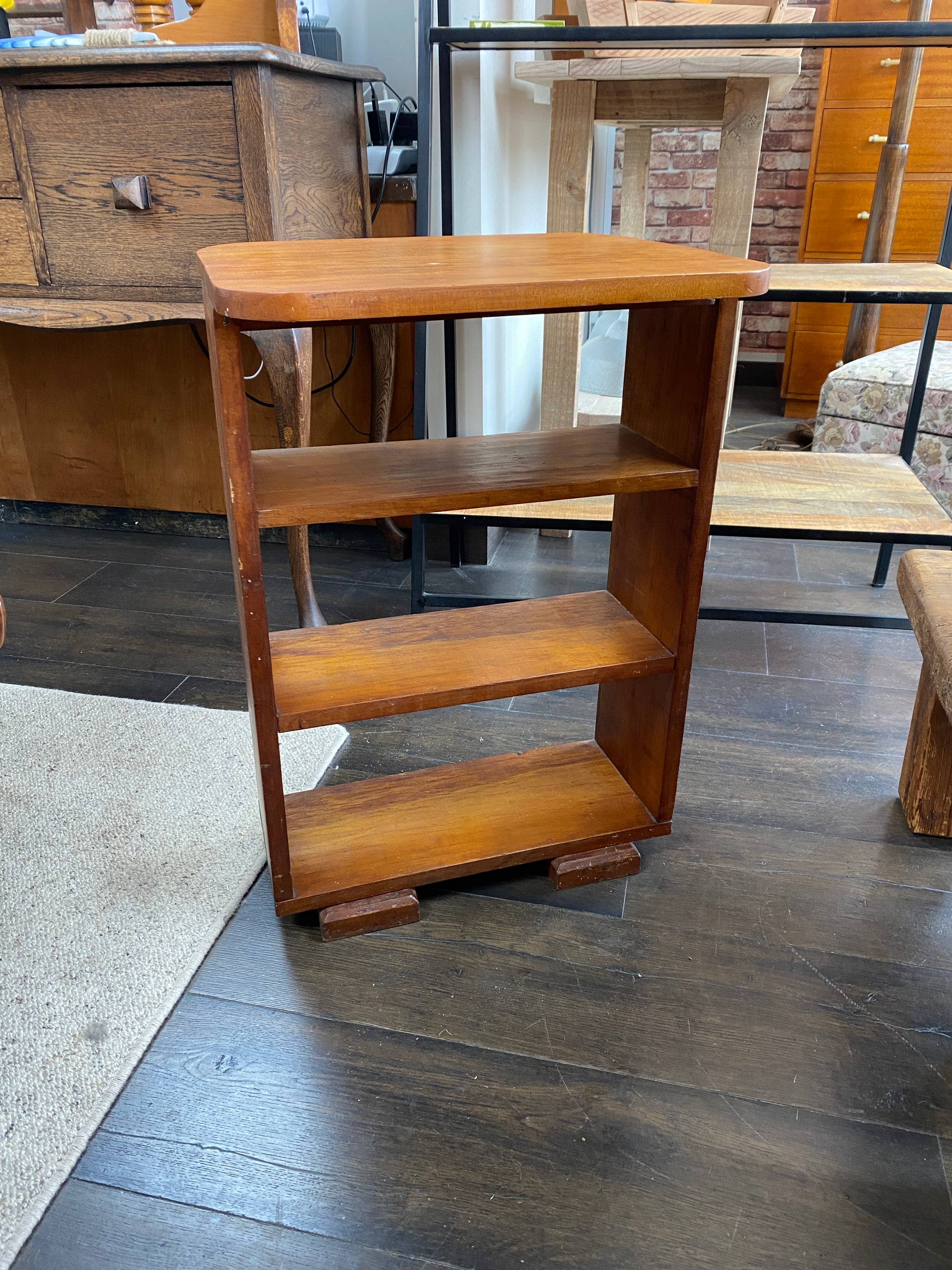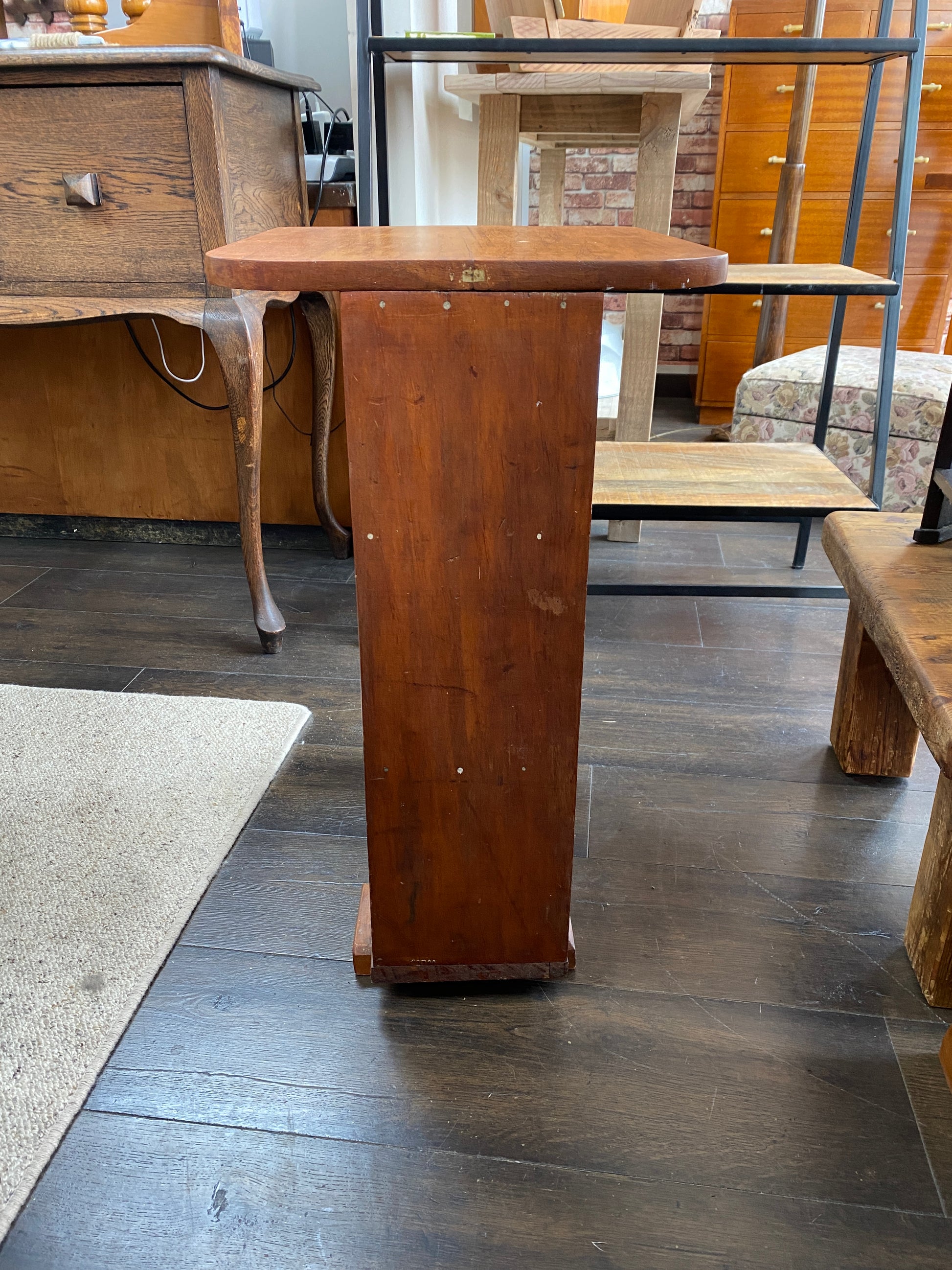 A funky Art Deco Style Scratch Built Hall Table in most likely Kauri. A fun piece made for a purpose from reclaimed materials, its ideal for a small spot to store your mini book collection and your favourite flowers. Some wear due to age and construction.