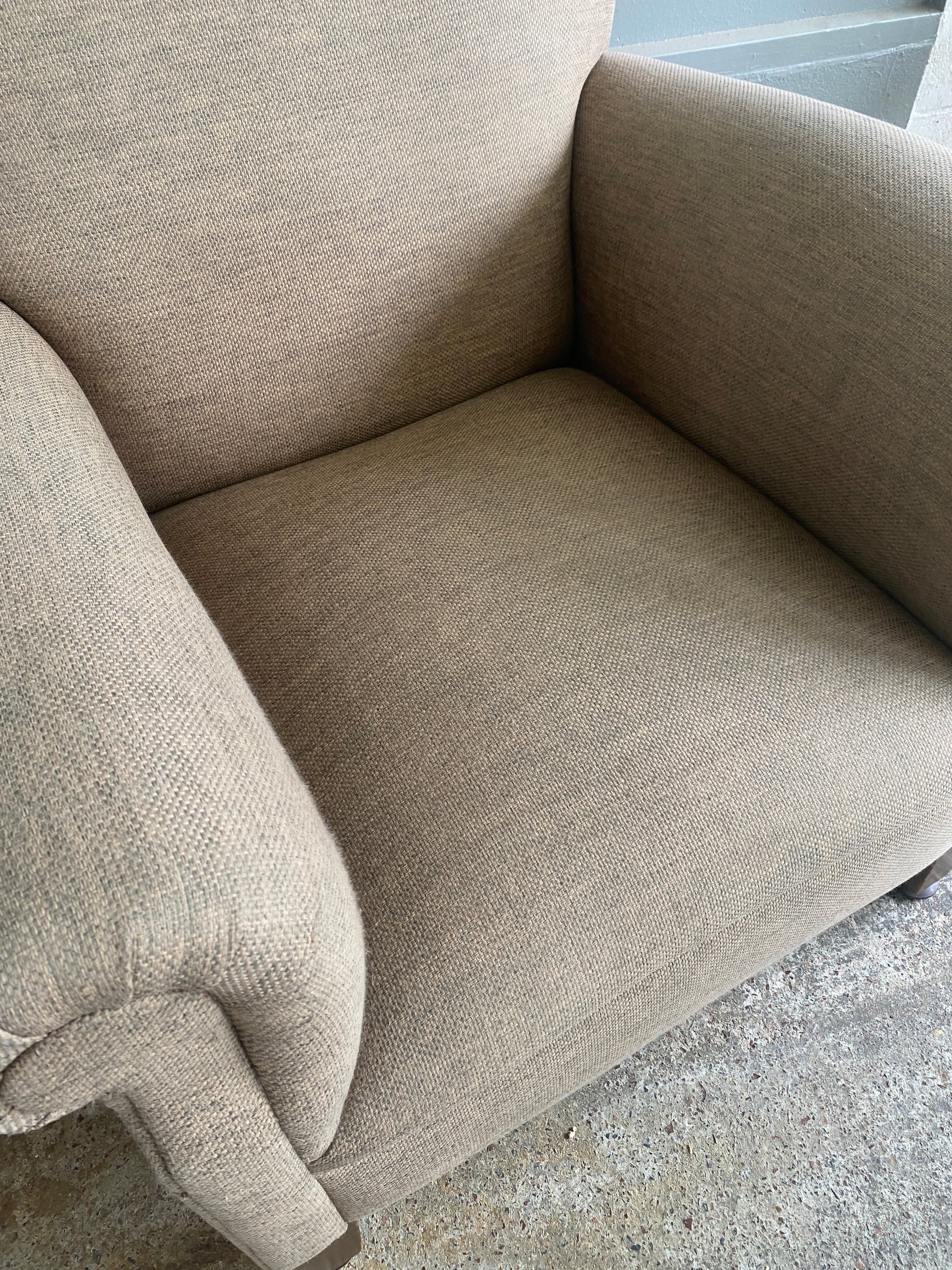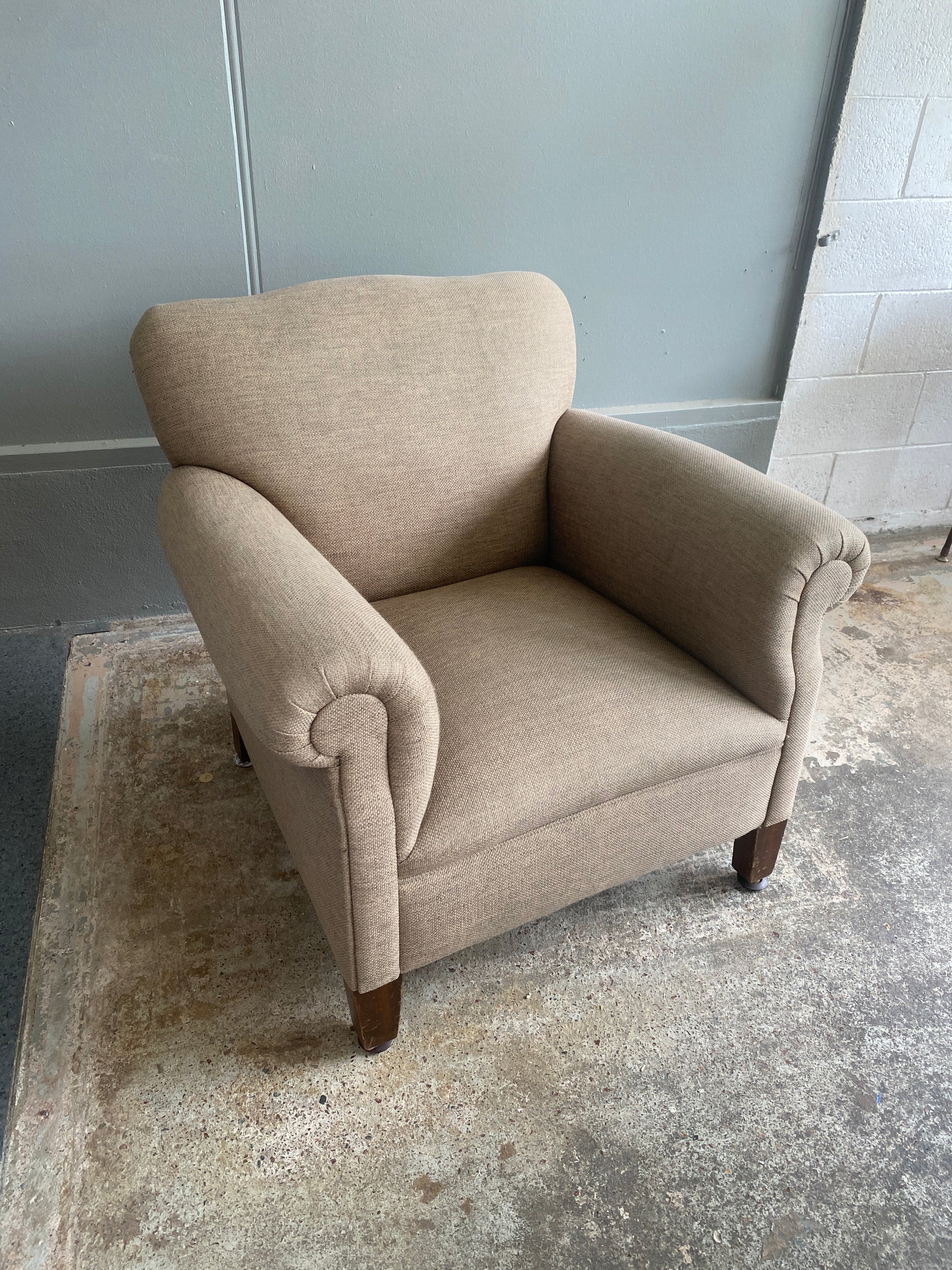 A stunning, Classic Roll Top Armchair - Oatmeal Fabric in lovely condition. Some minor wear on the legs, but no tears or stains. The fabric is a course, canvas like weave, extremely high quality. Very comfy! (The colour is a slightly olive green oatmeal that wasn't able to be captured with the lighting).