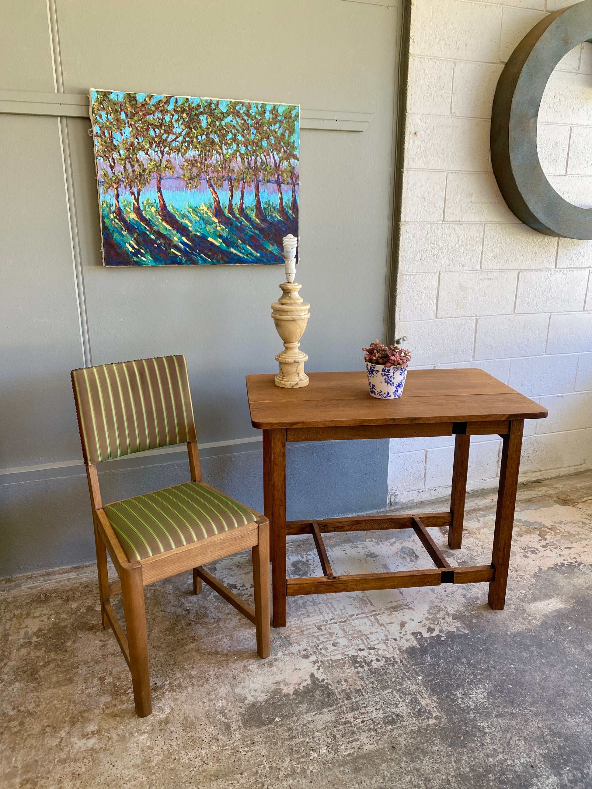 Each piece complements the others perfectly, creating a cohesive look that brings warmth, character, and artistic sophistication to any room. The green striped chair ties beautifully with the verdant tones in the artwork, while the oak furniture pieces create a unified foundation. **Excludes plant pot.