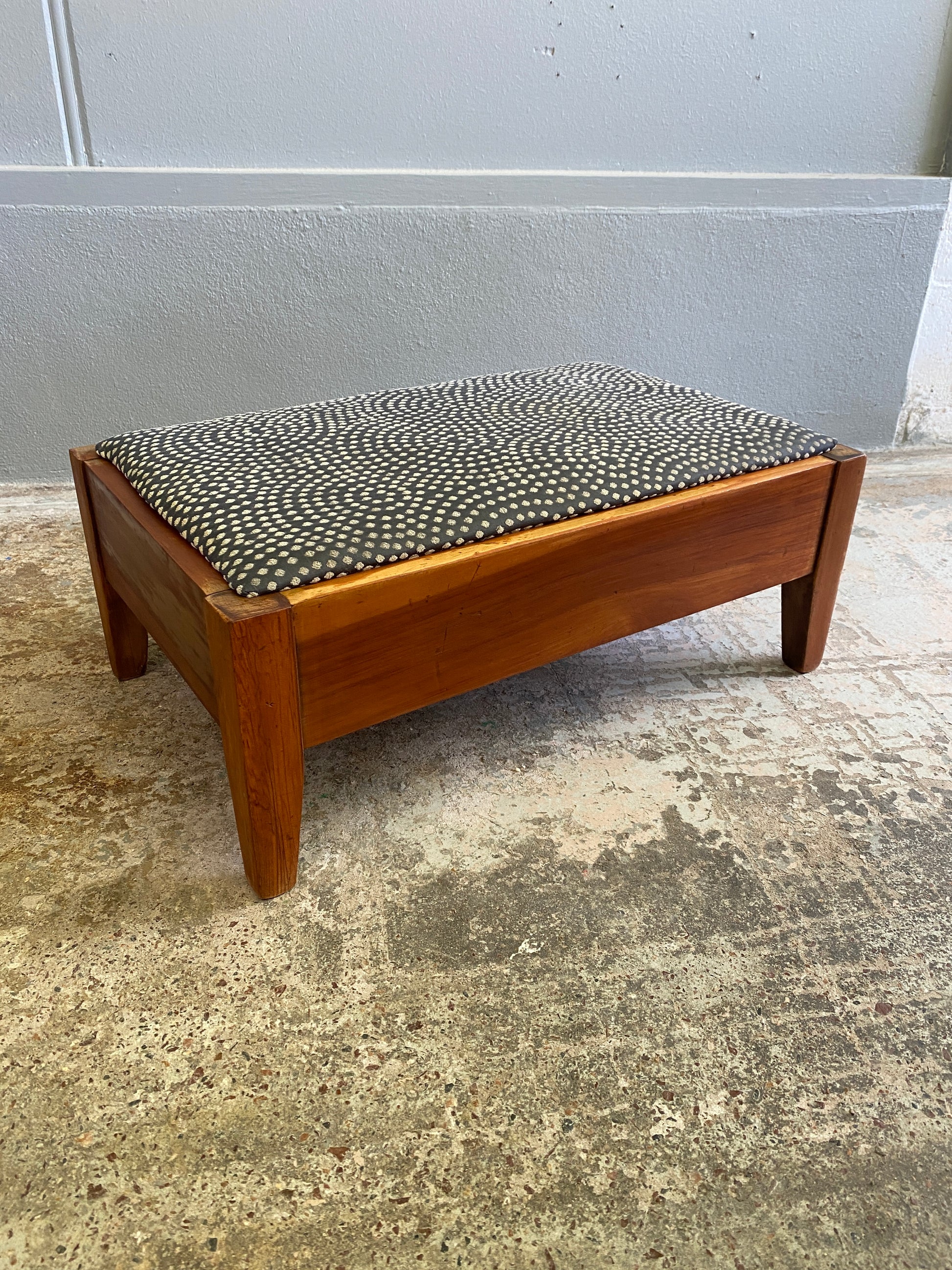 A lovely, solid Mid Century Modern Native Timber Footstool. It looks to be a timber like Matai and in solid condition. Has been re-oiled. The fabric is not original and can easily be changed.