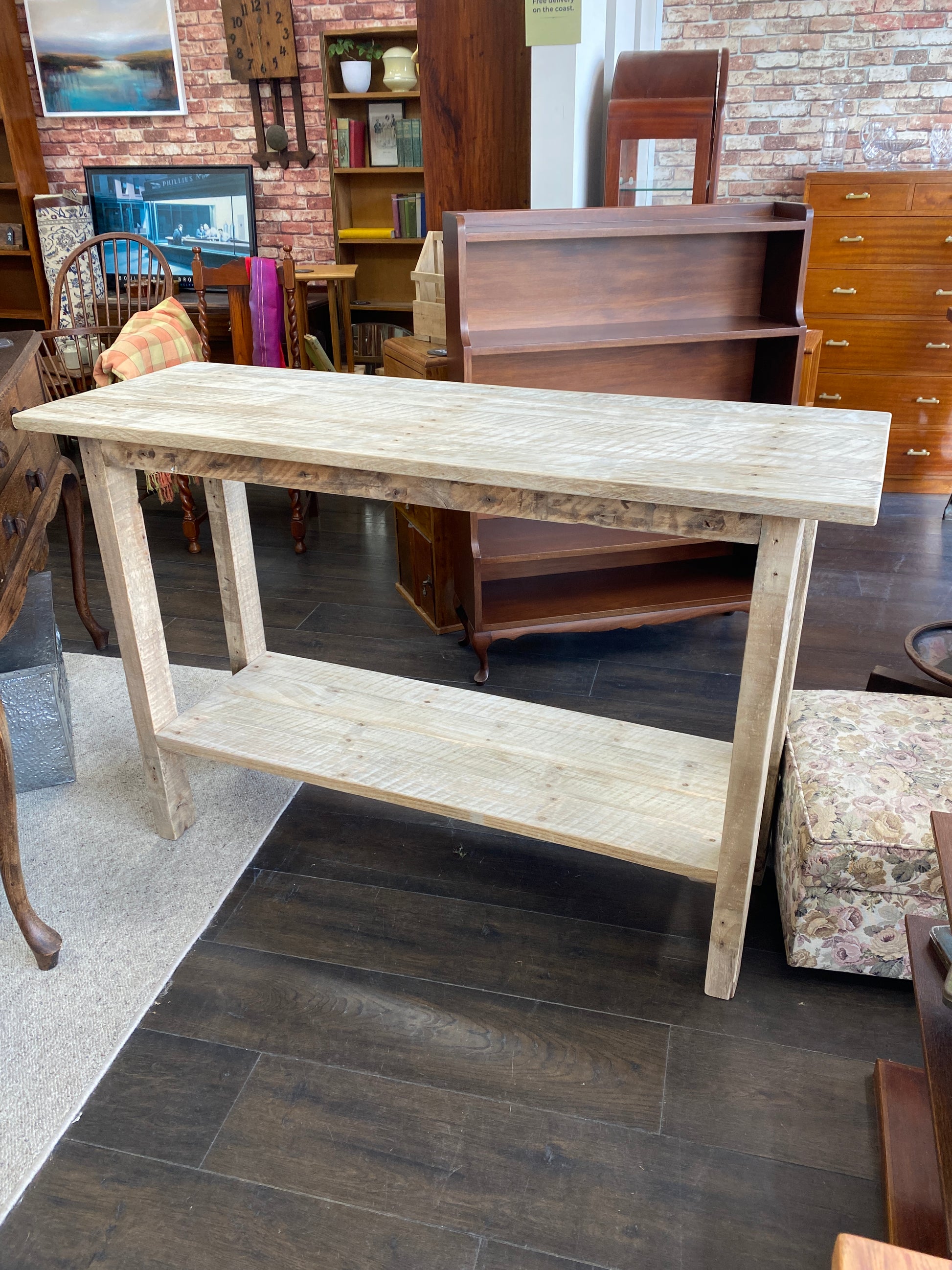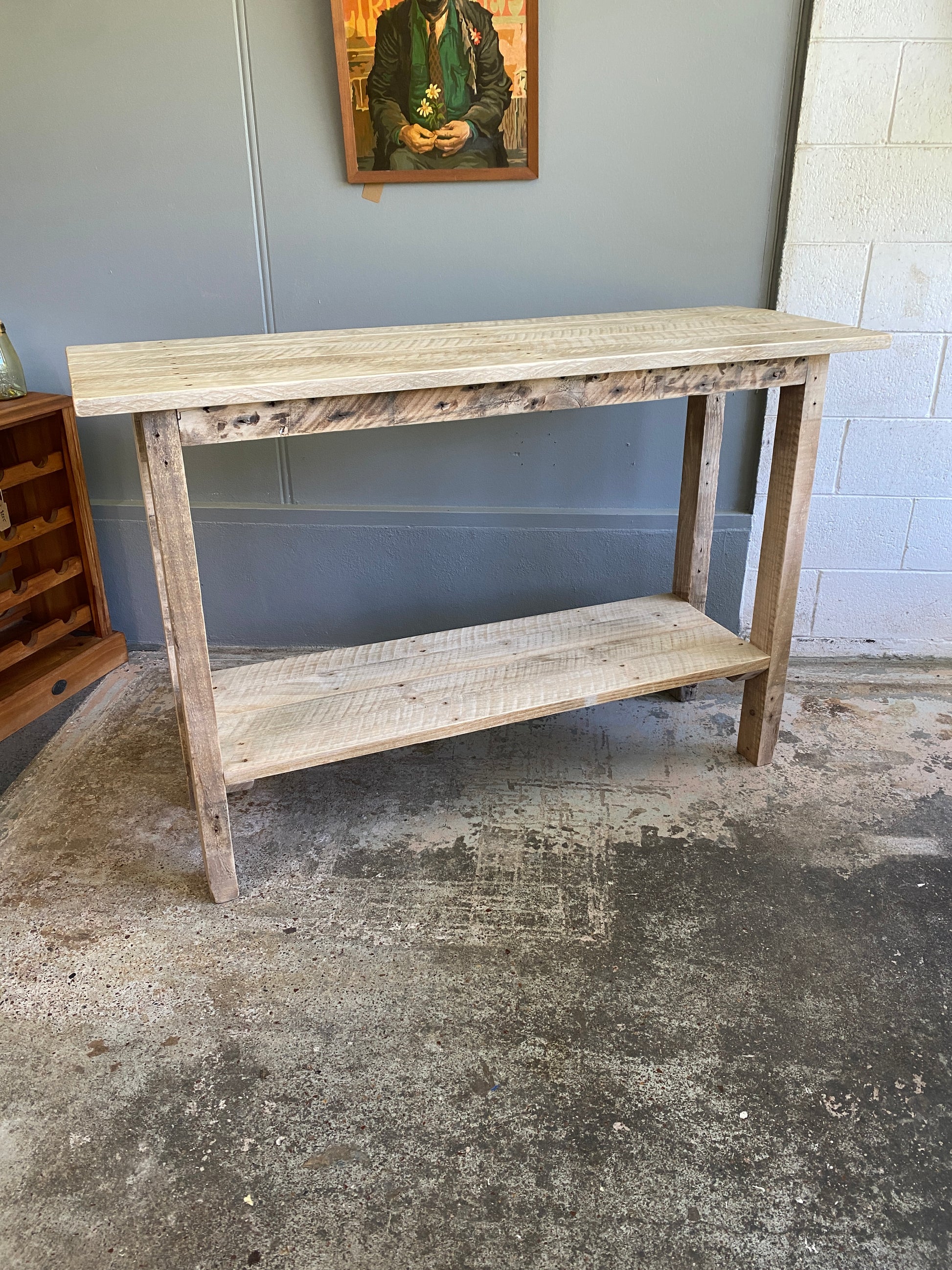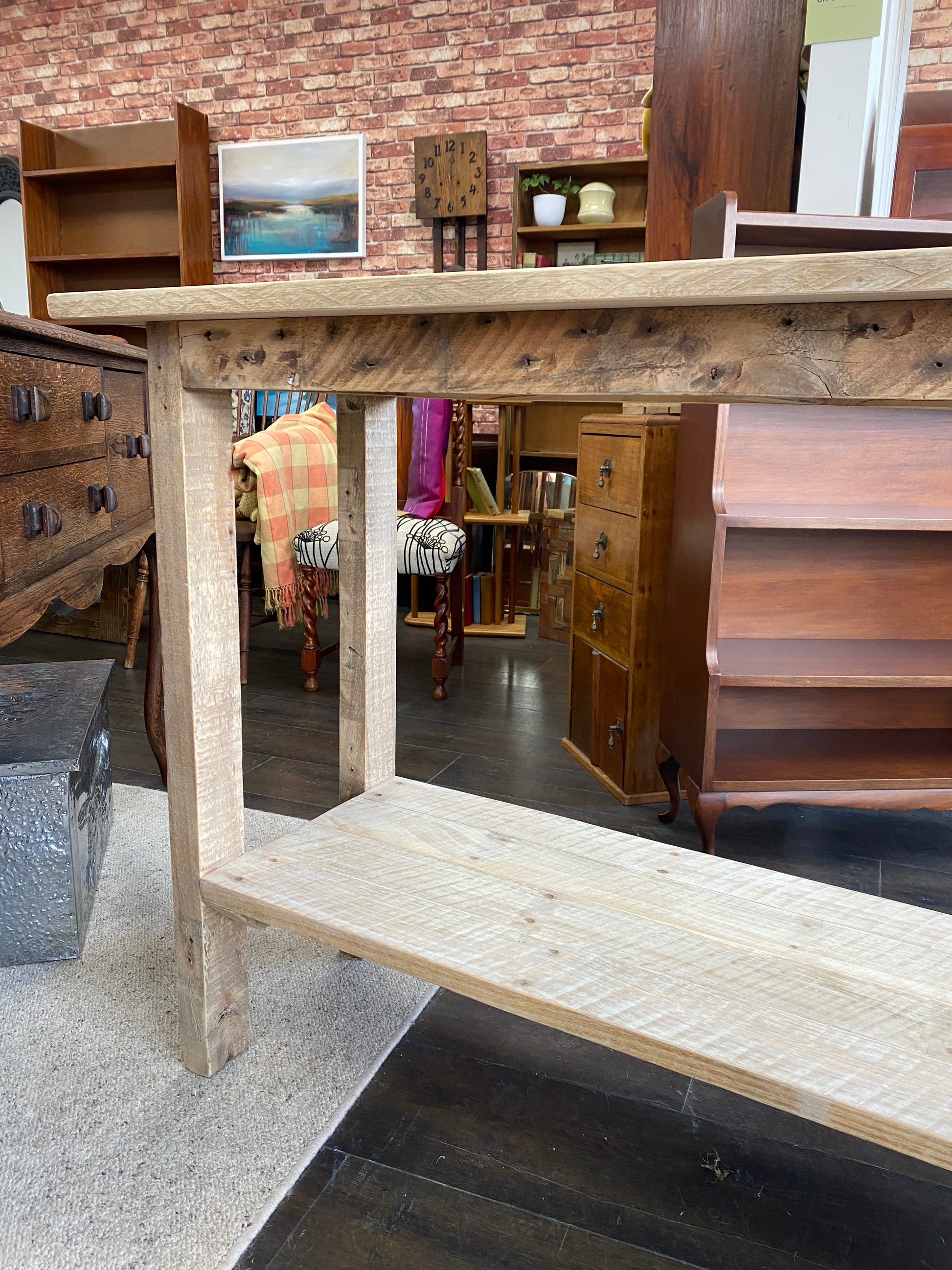 A stunning handmade Reclaimed Australian Gum Bar Leaner/Utility Table by Industrial Design NZ. This rough sawn timber is a light/blond smooth finish with a solid design. Use it for a hallway, bar leaner or in a kitchen. There is no need for new when vintage timber like this is so good.