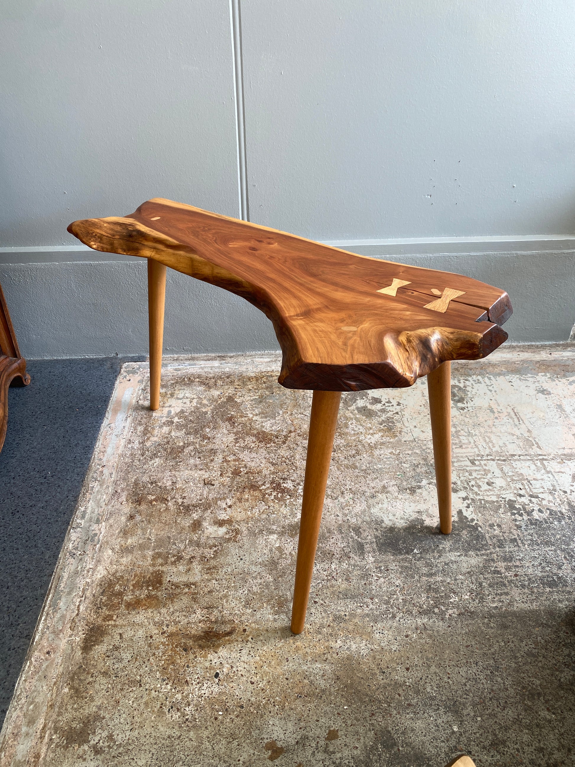 An incredible Reclaimed Black Walnut Custom Hall Table made my Industrial Design NZ. This hard to find timber is a live edge piece that has been hand finished with a retro twist in the legs. It's a show piece for any home.