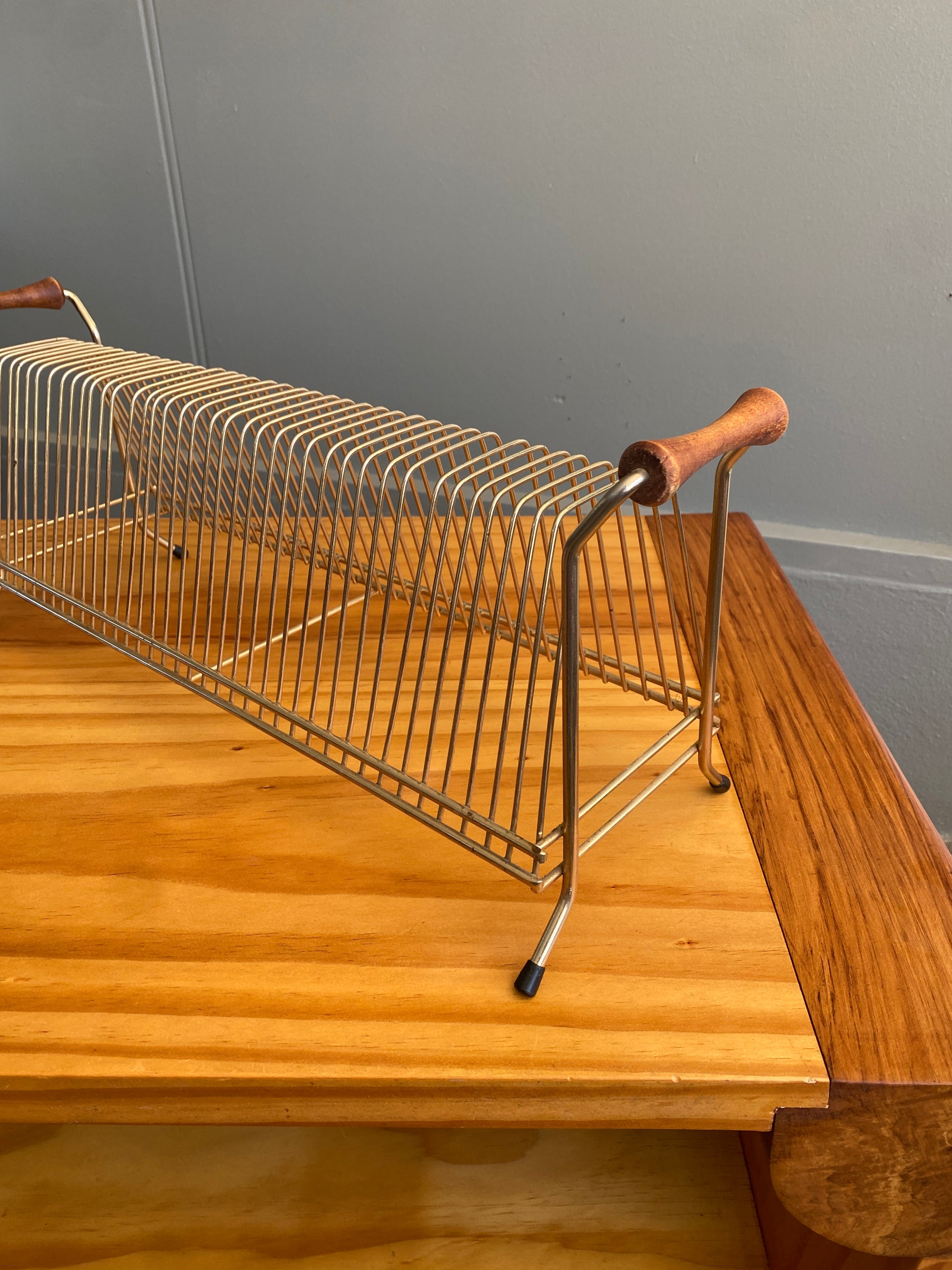 A very cool Retro Wire LP Rack with Mahogany handles in great condition. A real character piece, ideal for a smaller space. Holds 39 LPs.