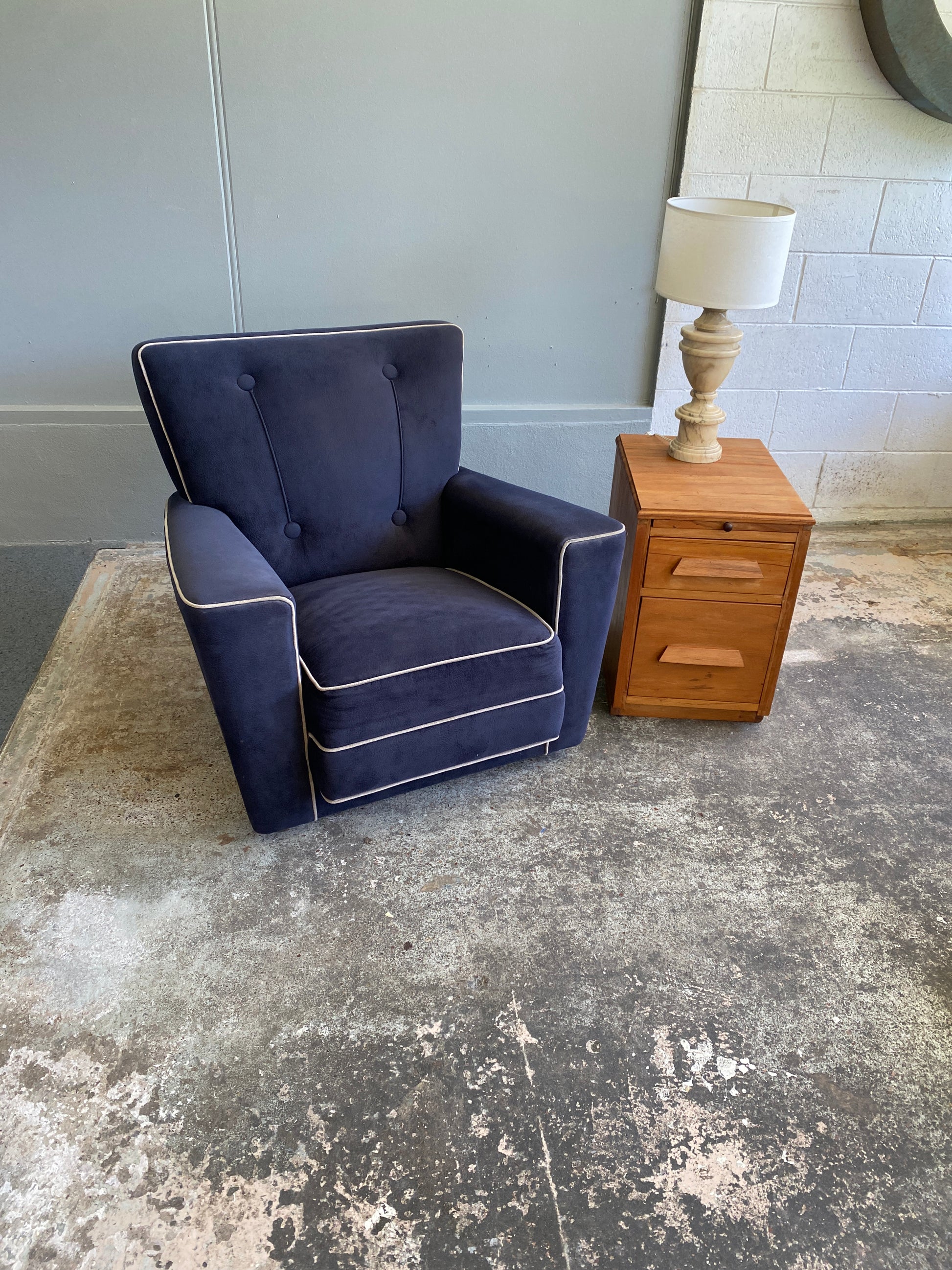 - Art Deco Suedette Button Back Arm Chair—luxuriously comfortable seating with elegant button-back detailing and soft suedette upholstery in a sophisticated blue hue