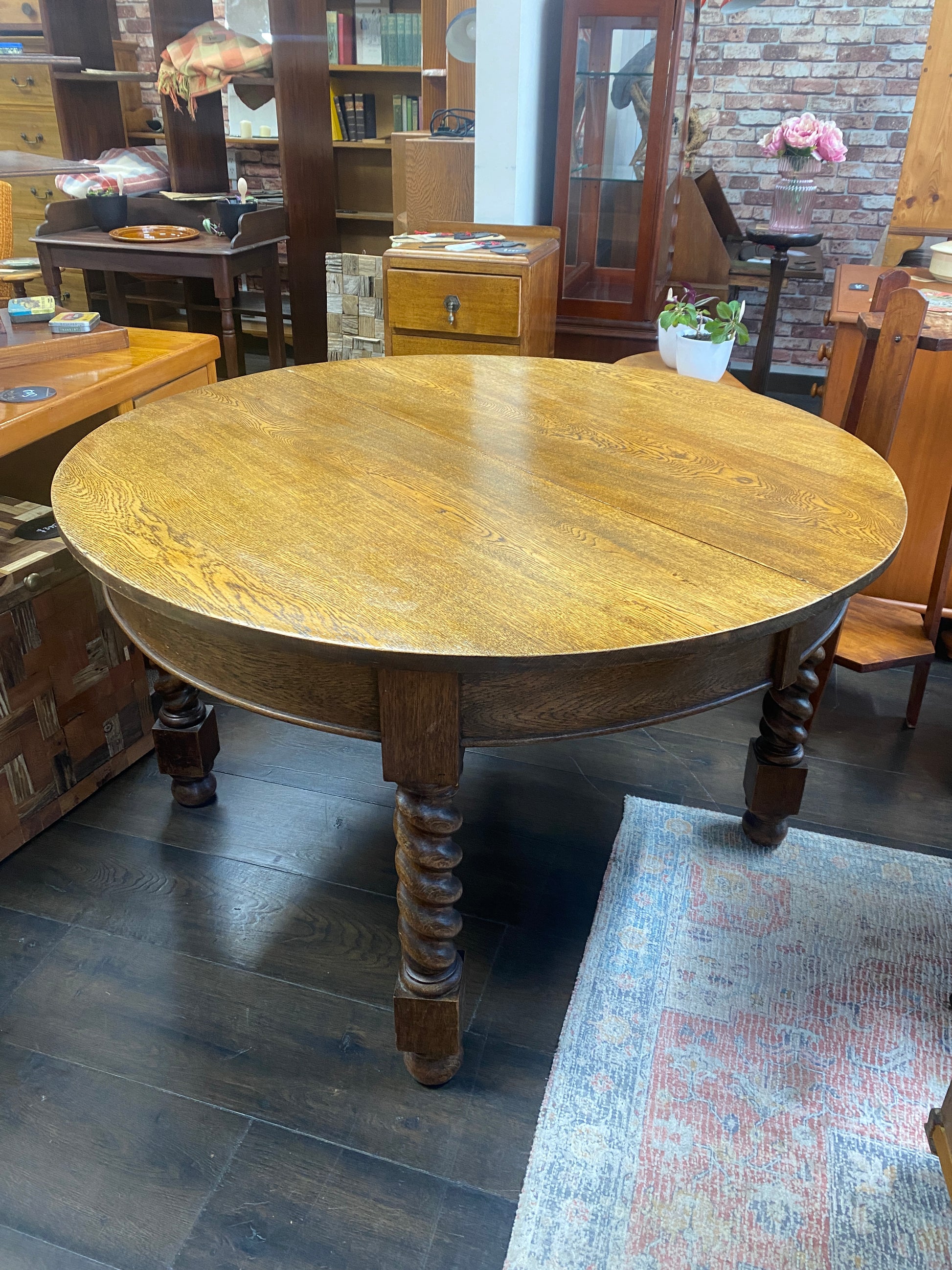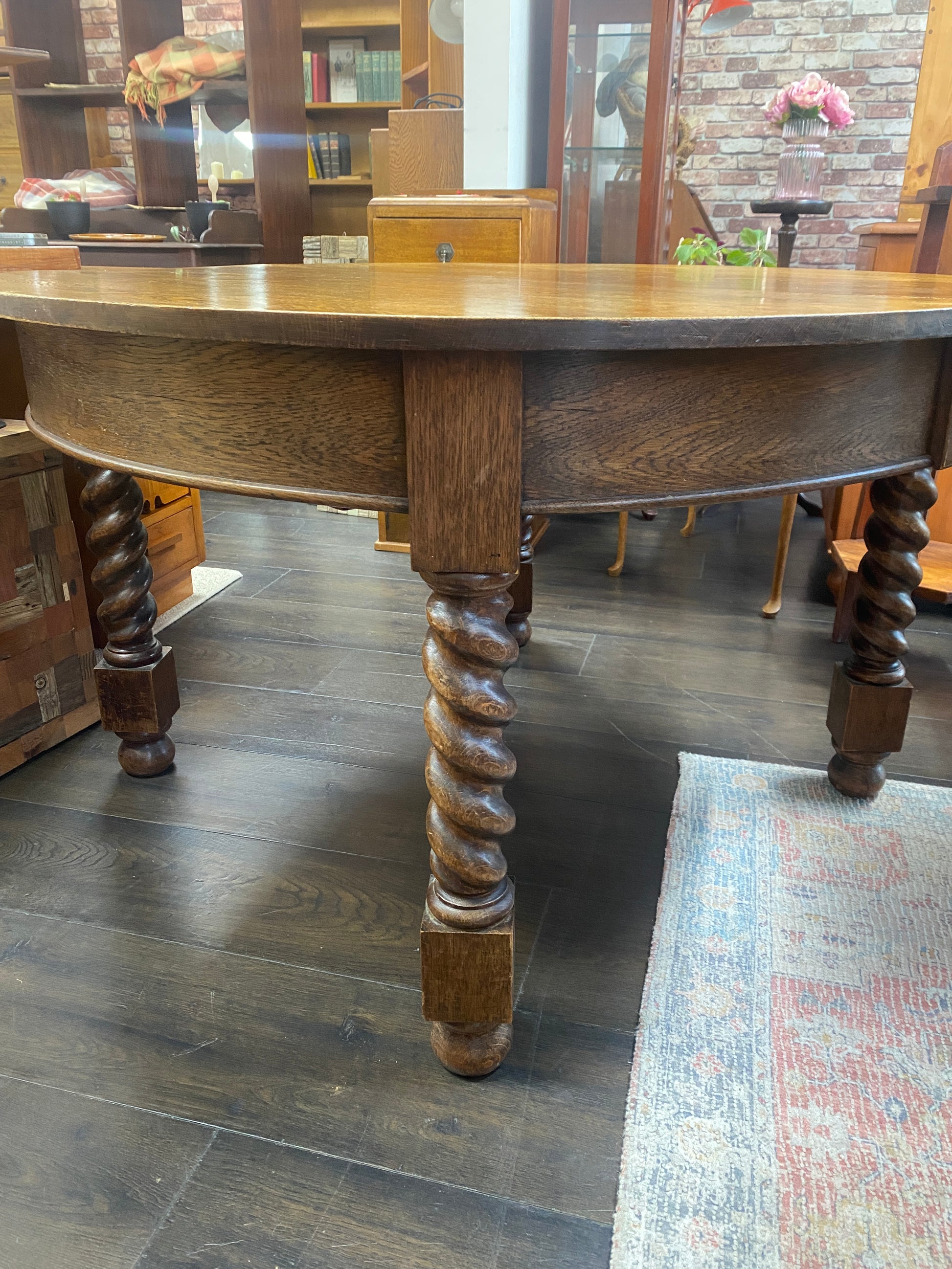 A gorgeous Victorian English Oak Dining Table with Barley Twist Legs in lovely condition. This is a hardy piece with tonnes of character. The legs are a lovely example of barley twist and the top is in very good condition. The height is a little lower than usual so please double check your chairs compared to table height.