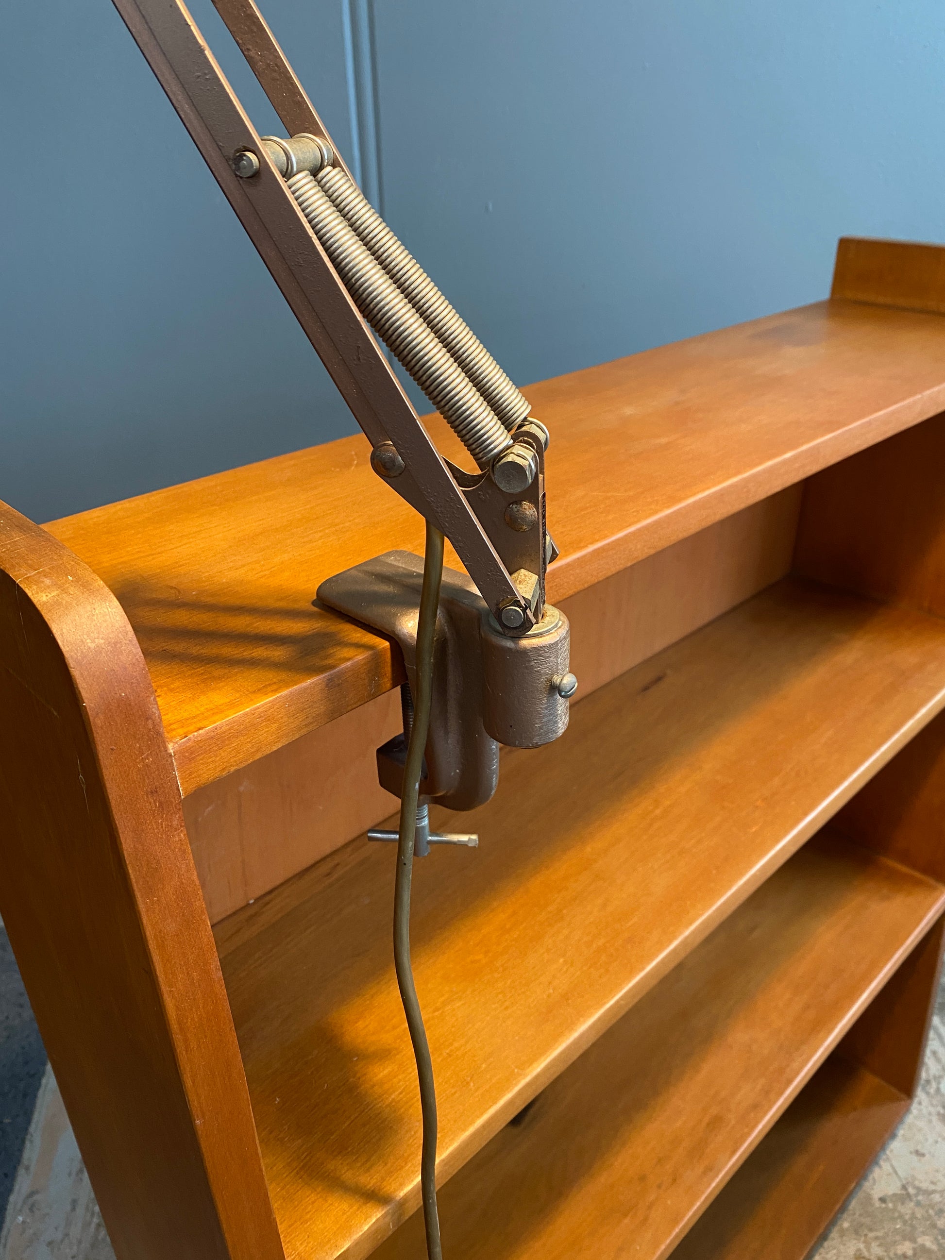 A lovely, original Vintage Blanch Engineering Bronze Machinists Lamp with clamp. In a traditional Bronze metallic paint with makers mark, this is a practical and stunning lamp. Fully working, original springs. Some minor paint wear from age and natural patina from use. Clamp depth 55mm.