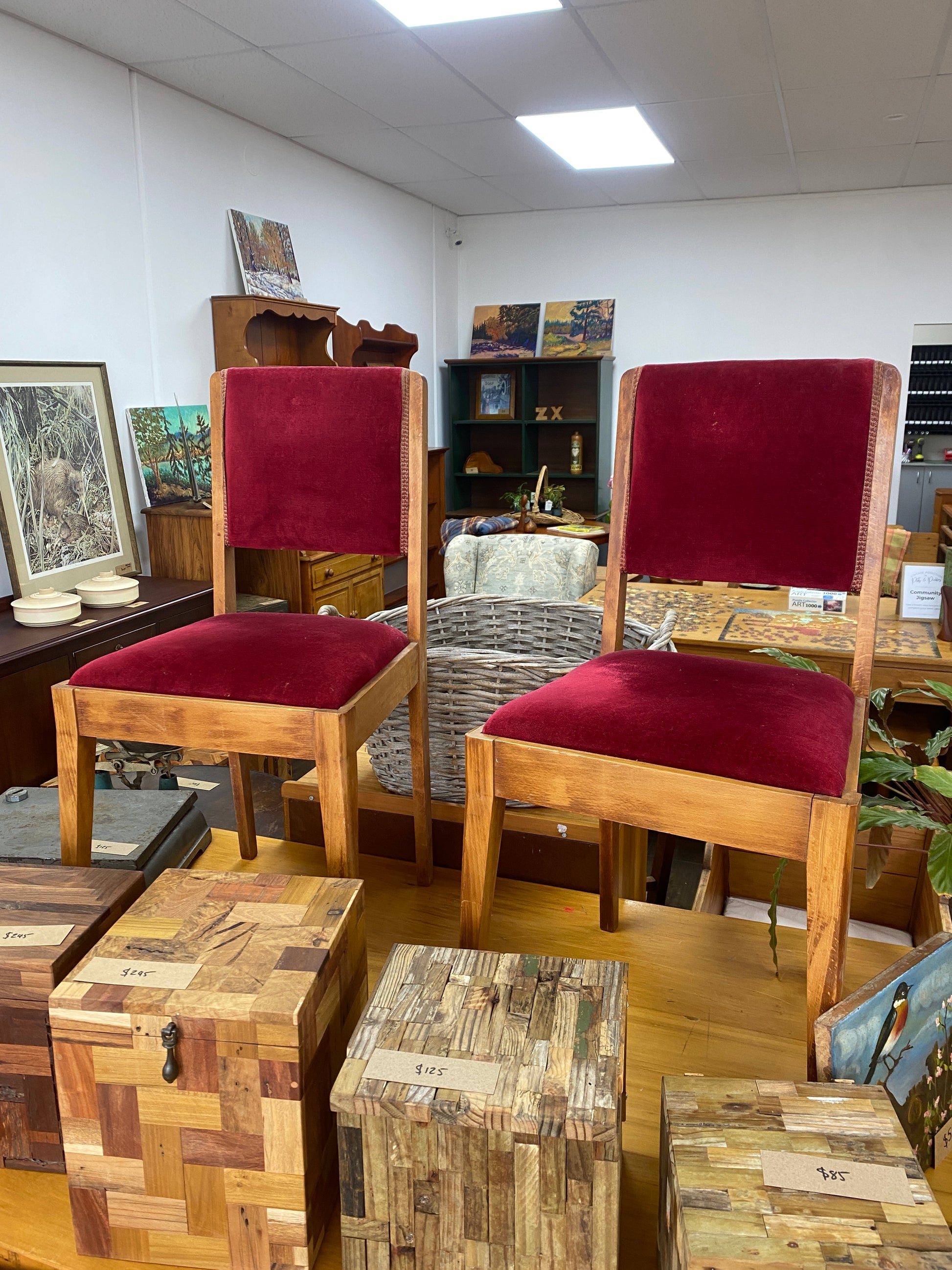 A lovely set of Vintage Deco Style Dining Chairs in lovely condition. The fabric is a deep scarlet red valour in great condition with next to no wear. Likely to have been replaced. Seat pads removable.