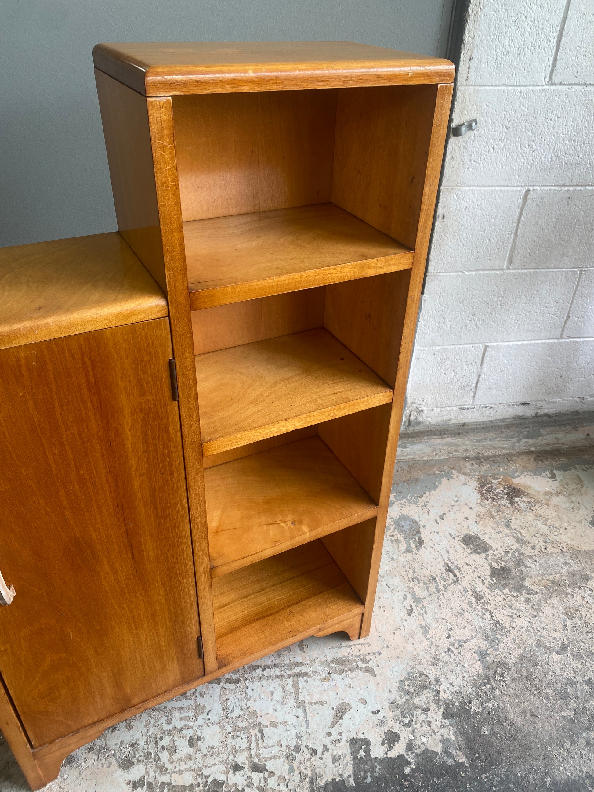 A stunning, practical Vintage Maple Art Deco Bookcase in lovely original condition. This is the perfect piece for a small space with big character. The Maple grain is incredible and there is minimal wear on this piece. With period appropriate Bakelite handle.