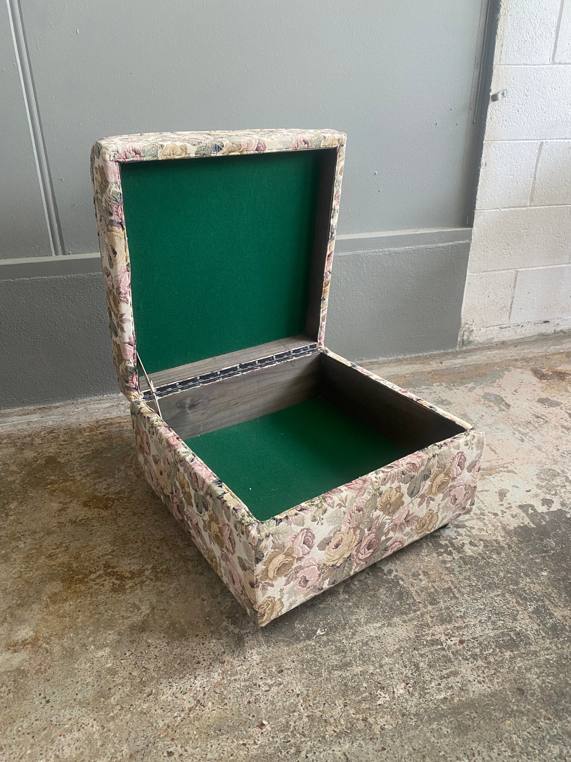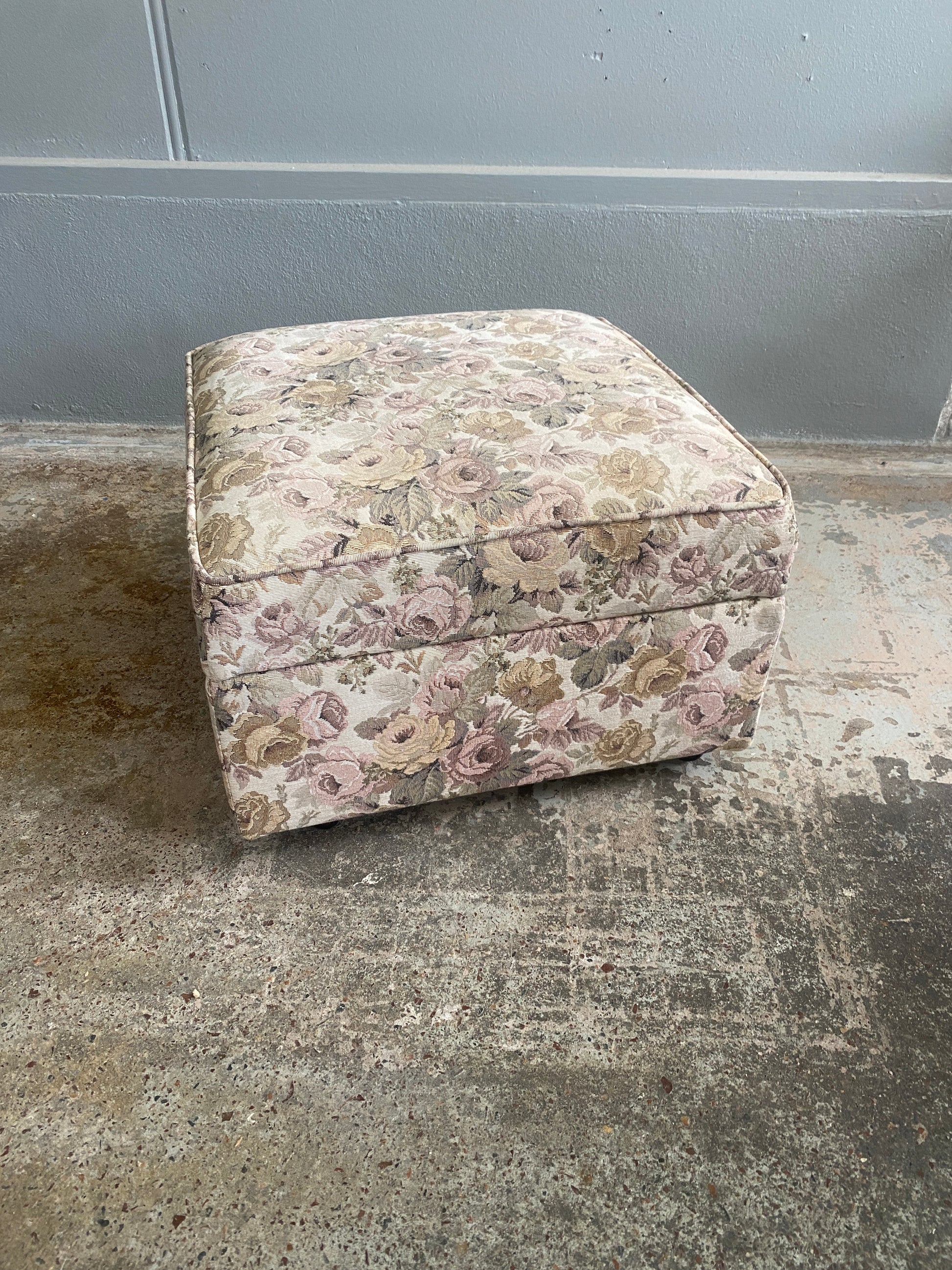 A pretty, great condition Vintage Patterned Ottoman that has be recovered. The outer fabric is near mint with no tears or rips. The interior has been relined and in excellent condition. Has castors.