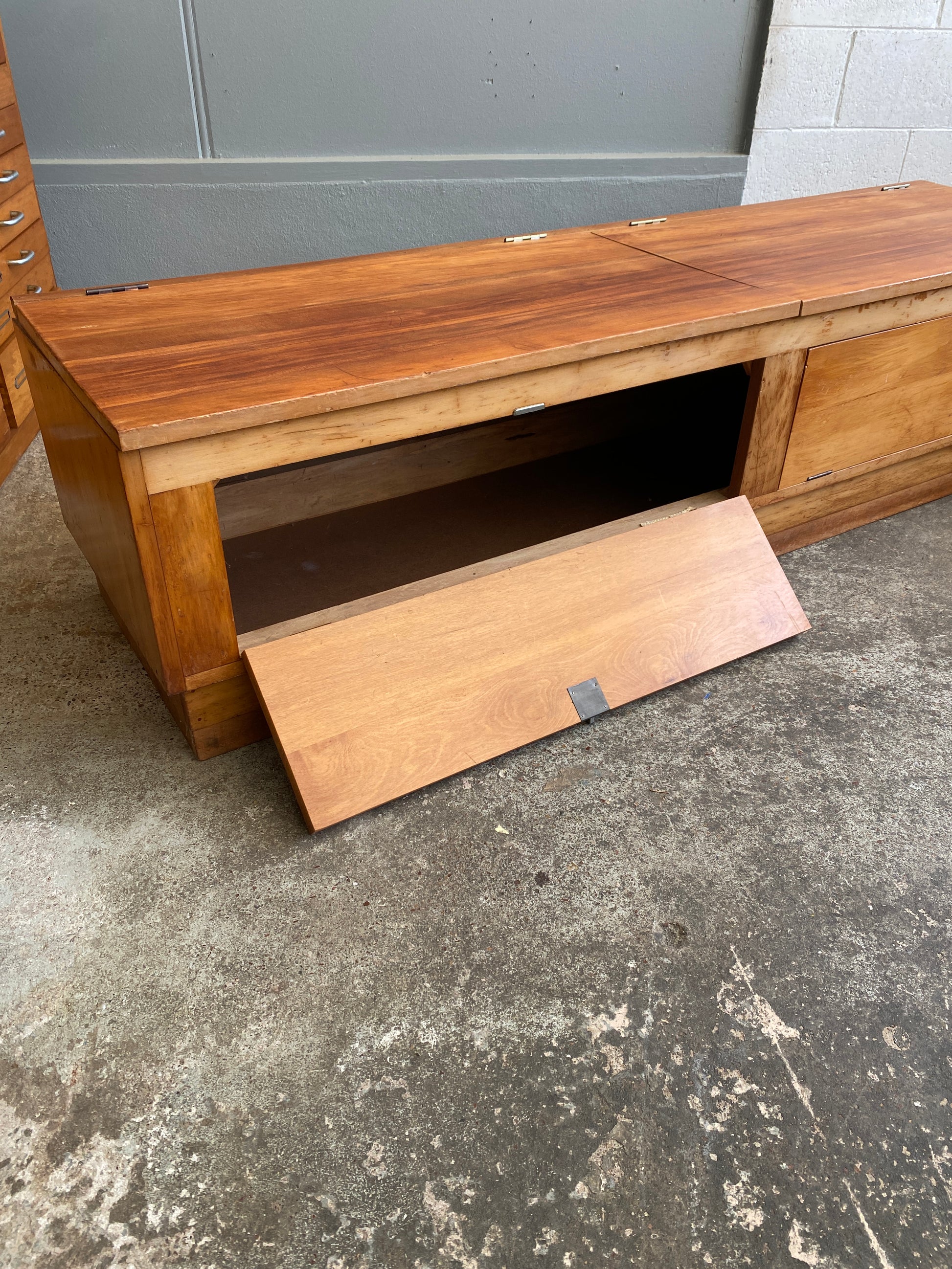A super practical Vintage Reclaimed Rimu Bench & Shoe Storage Box. The perfect piece to tuck your shoes in and keep the hall tidy as well as take a well earned rest. Made for this very purpose, this it is the ultimate vintage storage piece. Top has been sanded and oiled. Some wear due to age.