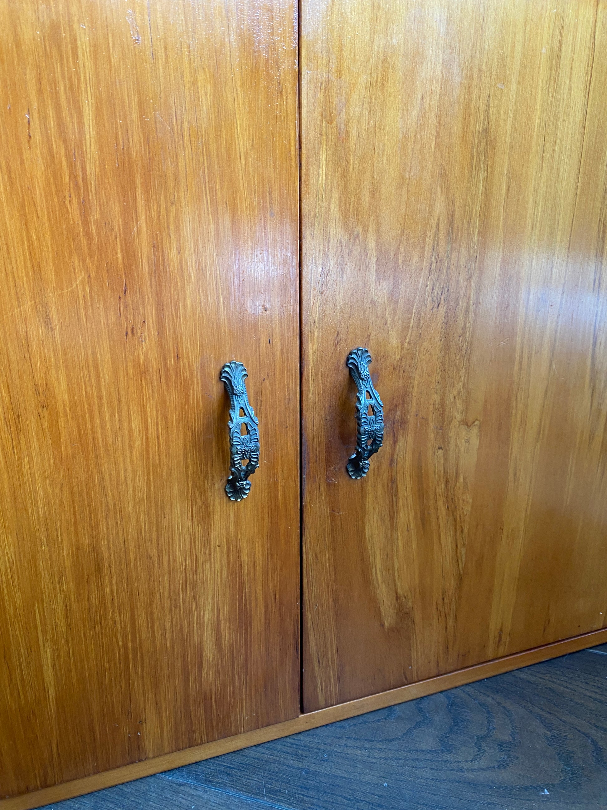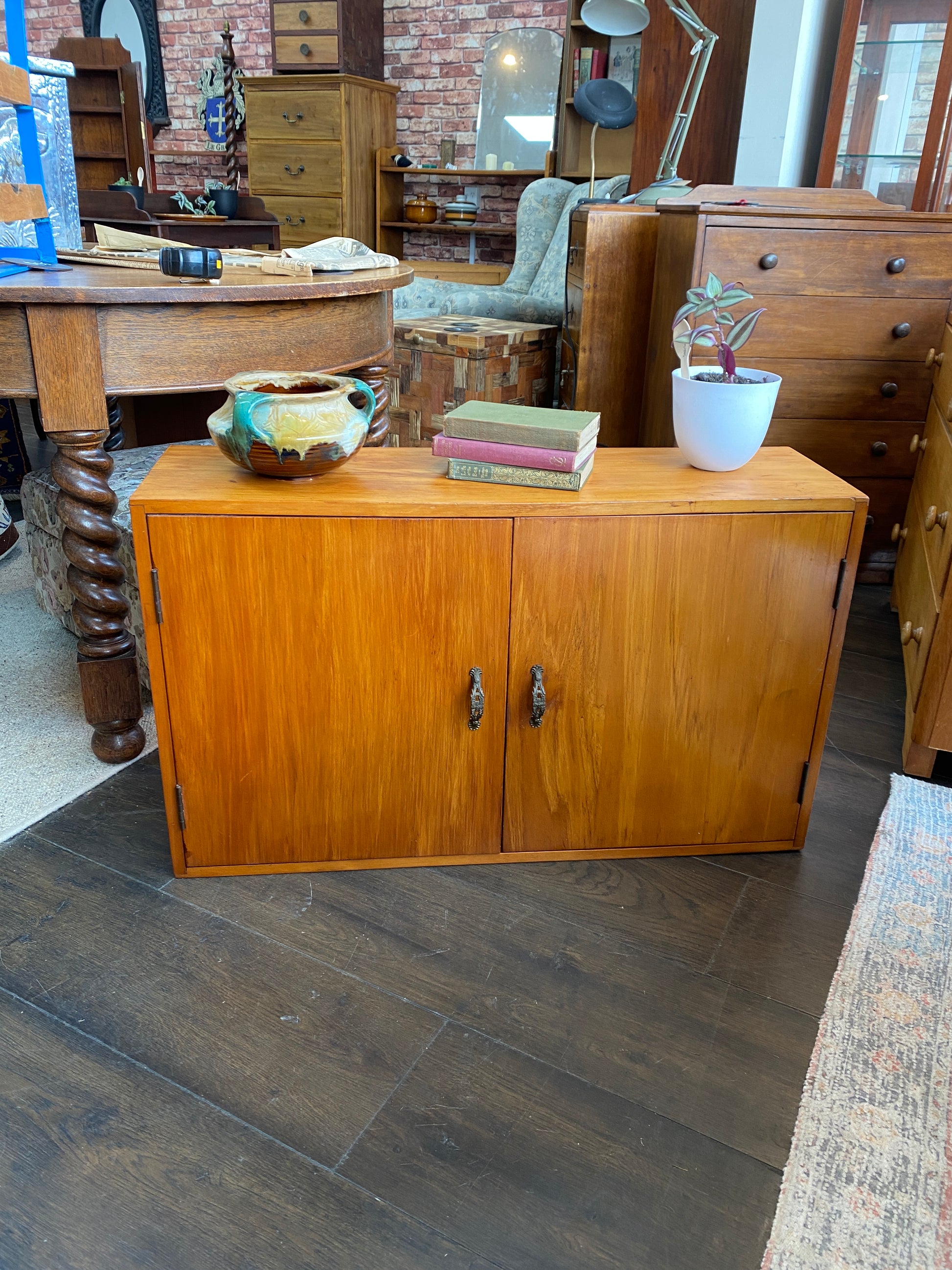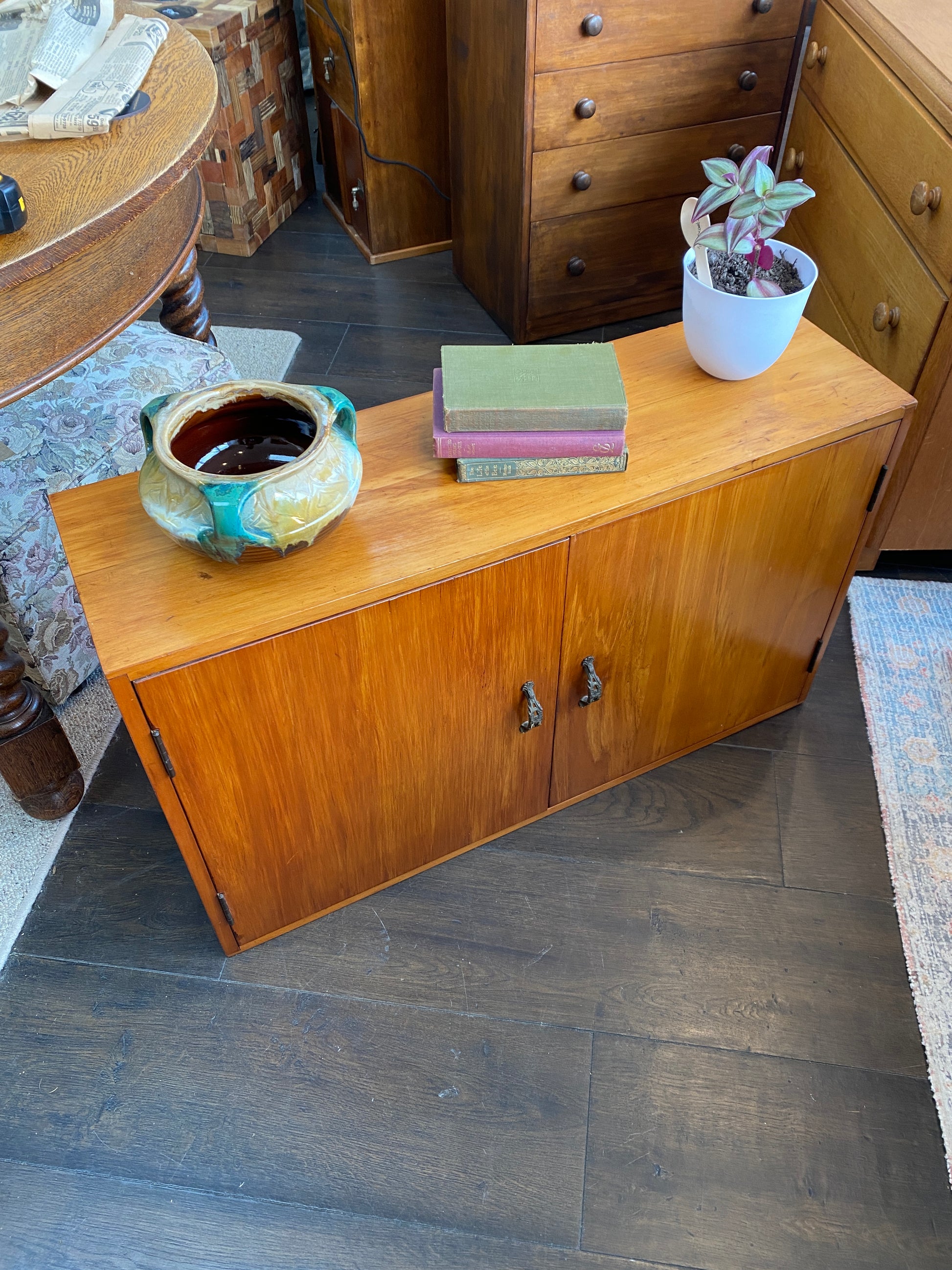 A cute little Vintage Rimu Storage/Bookcase with ornate handles. This is an upcycled piece from a kitchen. Now it serves a great little unit for the end of the couch or for a smaller place looking for storage or a space for your favourite reads. Very good condition with minor wear from age.