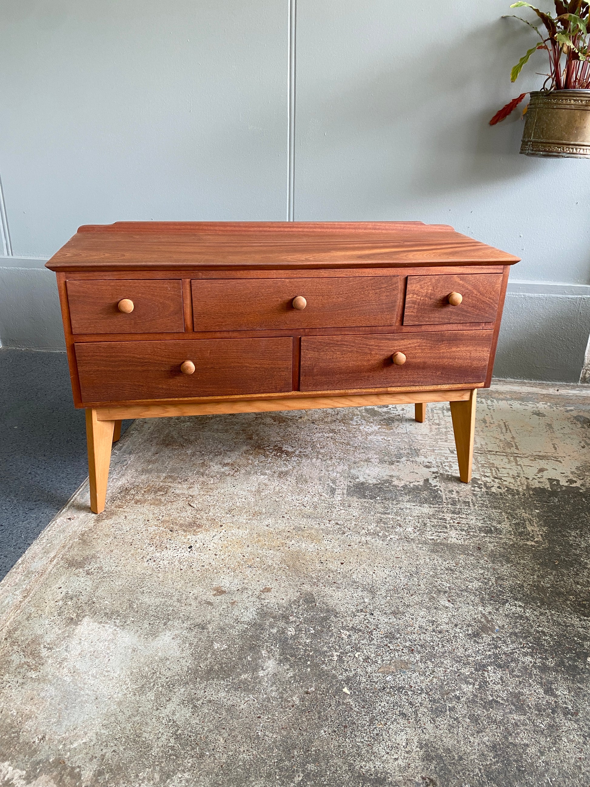 A spectacular Vintage Robert Allen Mahogany & Kauri Dresser that has been fully refinished and updated with reclaimed Kauri legs. The new finish is matt with a focus on bringing out the richness of the timber while maintaining the grain. This is a one-off piece from Industrial Design NZ.