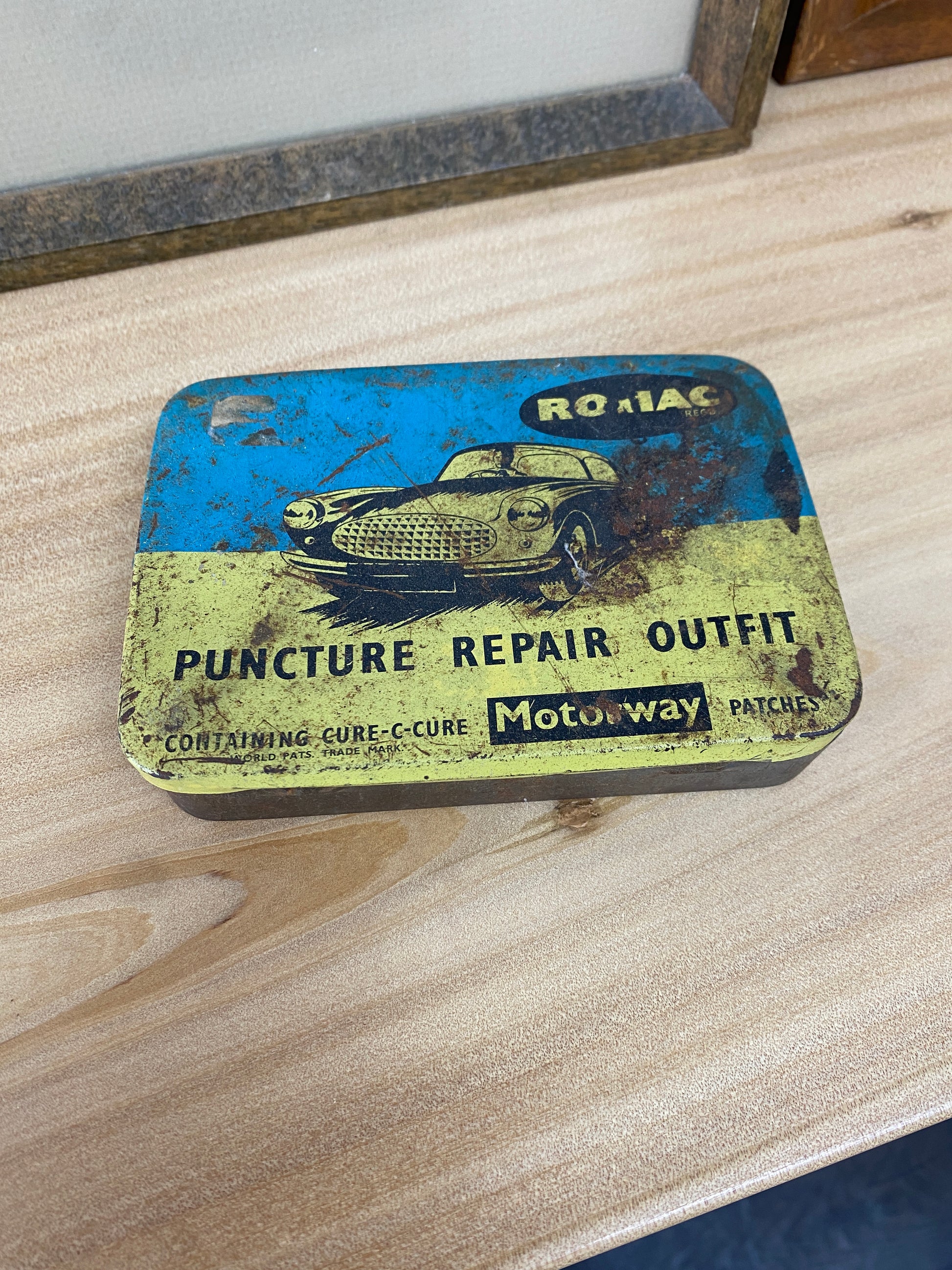 A classic Vintage Romac Tyre Repair Tin in worn condition.